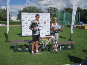 Erki Mitman võidetud karika ja jalgrattaga ning treener Kaja Ladvaga. Foto Viktoria Mitman