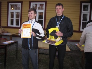 Jooksu üldvõitja meeste arvestuses Argo Jõesoo (paremal) ja rõõmsalt üllatunud Joonas Tomingas (vasakul) autasustamisel . Foto Ülle Lass